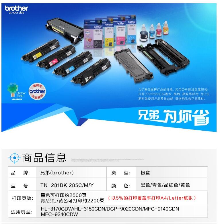 • 商品名稱(chēng):兄弟(brother)TN-285C青色粉盒 適用于兄弟3150CDN/3170CDW/9020CDN/9140CDN/9340CDW
