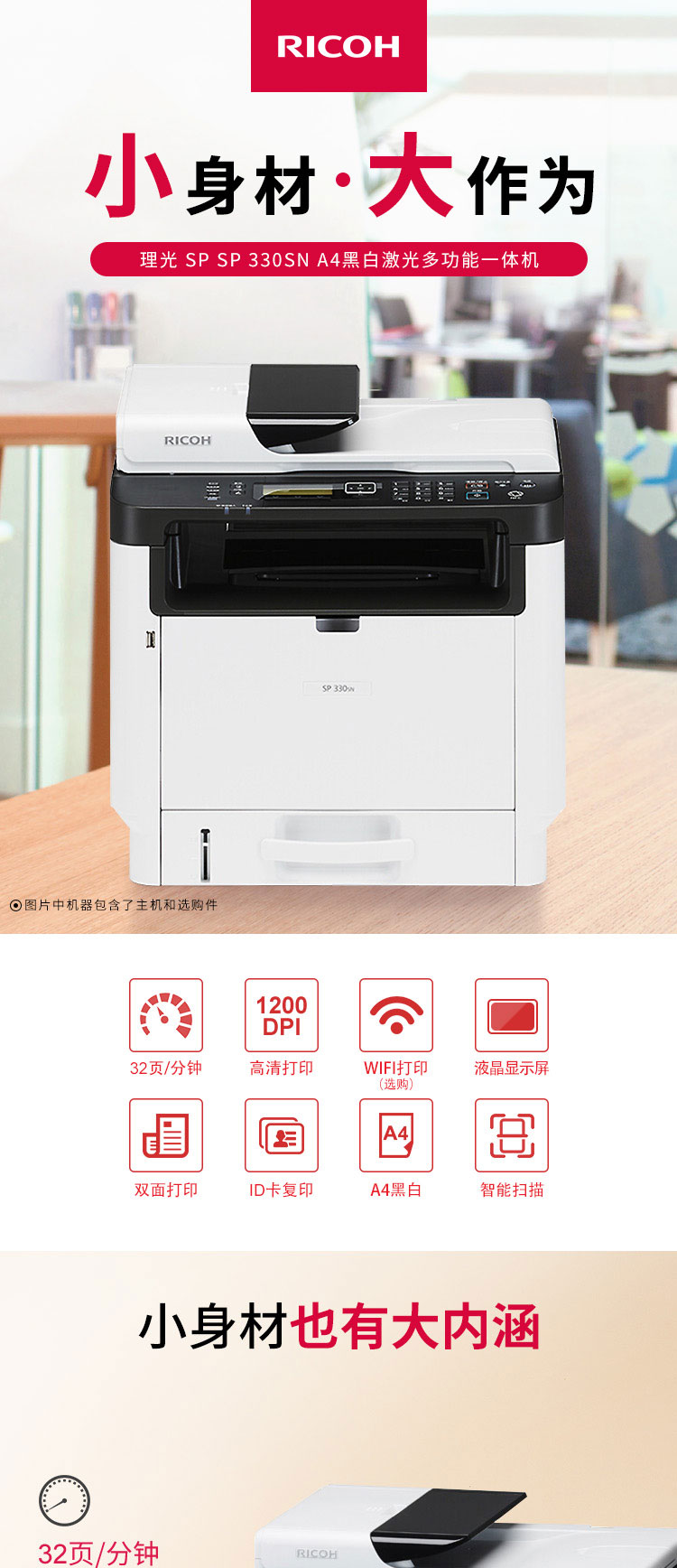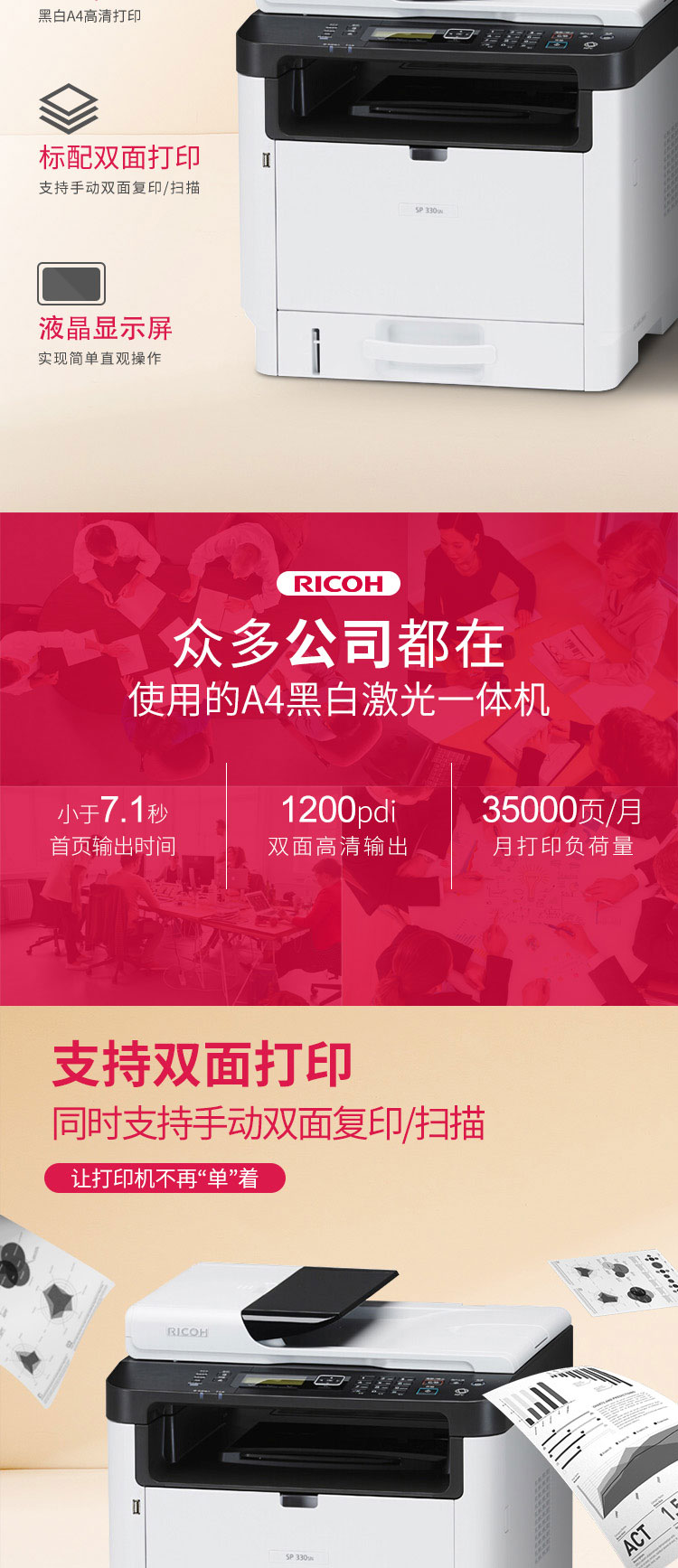 理光(Ricoh)SP 330SN A4黑白激光多功能一體機 辦公網(wǎng)絡(luò)打印雙面復(fù)印掃描一體機 打印/復(fù)印/掃描 標(biāo)配