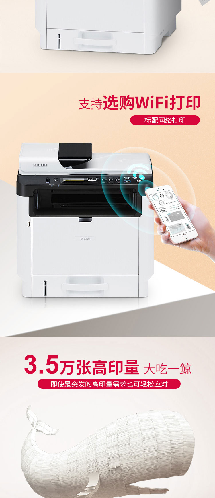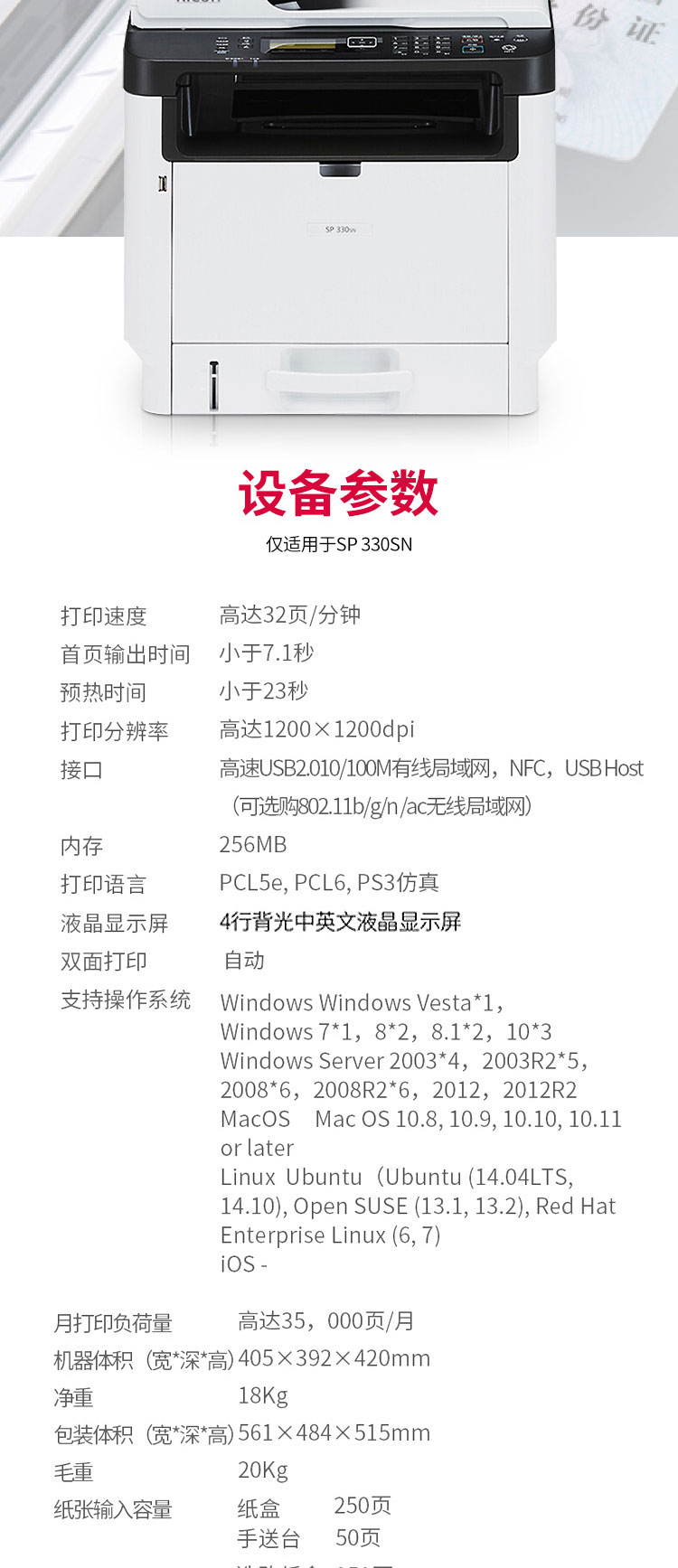 • 商品名稱:理光(Ricoh)SP 330SN A4黑白激光多功能一體機 辦公網(wǎng)絡(luò)打印雙面復(fù)印掃描一體機 打印/復(fù)印/掃描 標(biāo)配
