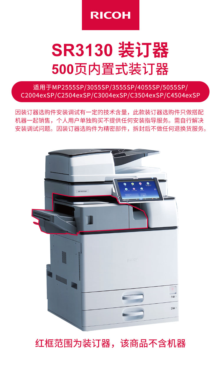 • 商品名稱:理光(Ricoh)500頁內(nèi)置式裝訂器SR3130 適用于MP 2555SP/3055SP/3054SP/3555SP/4055SP/5055SP/C2004exSP/C2504exSP/C3004exSP/C3504exSP/C4504exSP