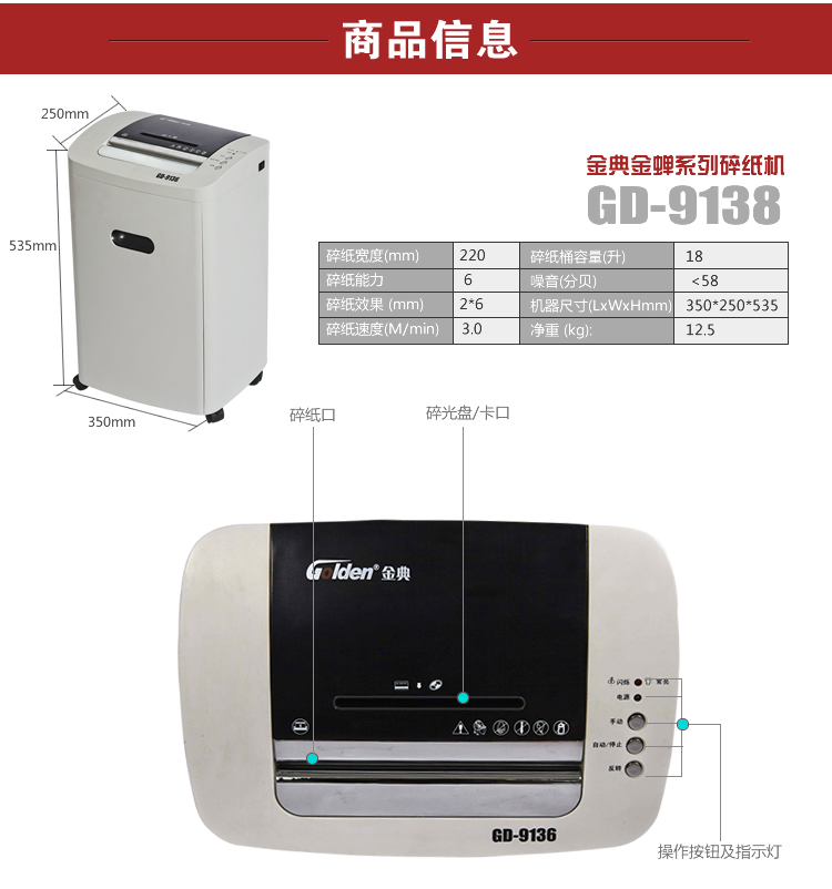 • 商品名稱:金典(Golden) GD-9136 商用辦公碎紙機 4級保密(kj)