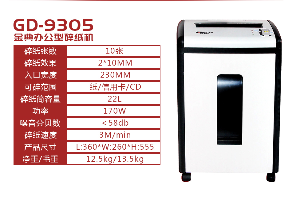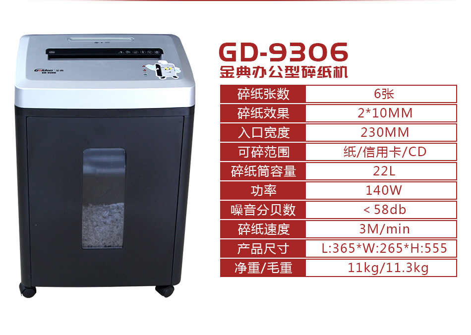 金典(GOLDEN) GD-9305 商用辦公碎紙機(jī) 4級(jí)保密電動(dòng)家用粉碎機(jī) 可碎紙/信用卡/CD 新款碎紙機(jī) (kj)