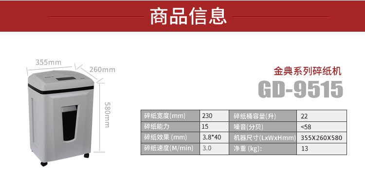 • 商品名稱:金典(Golden) GD-9515 碎紙機辦公電動 碎紙機段狀大功率靜音碎紙機 (kj)