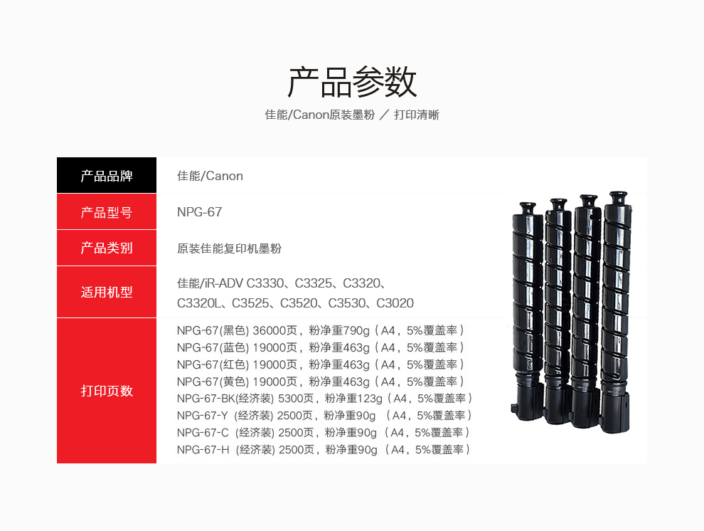 • 商品名稱:佳能(Canon)碳粉(黑色)NPG-67 大容量 適用于iR-ADV C3330/C3325/C3320/C3320L/C3520/C3530/C3020(kj)