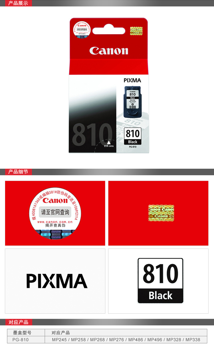 - 商品名稱:佳能 (Canon)PG-810 黑色墨盒 適用MP245 MP258 MP268 MP276 MX328 MX338 MP468 MP496
