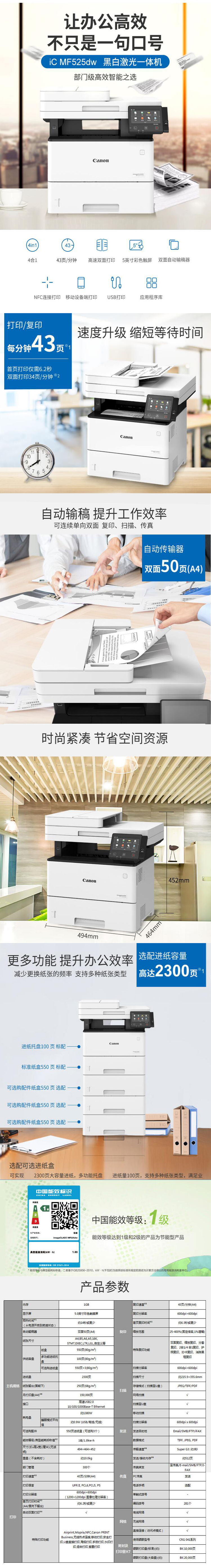 - 商品名稱:佳能(Canon)imageCLASS MF525dw 黑白激光多功能一體機 (打印/復印/掃描/傳真)