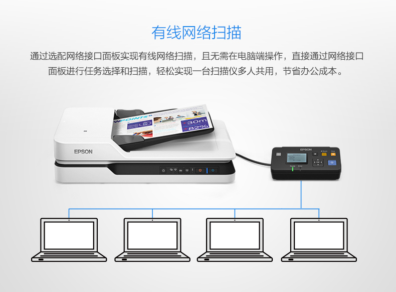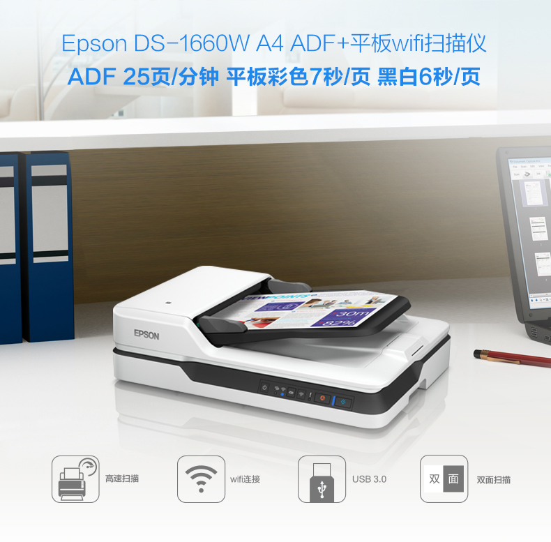 愛(ài)普生(EPSON) DS-1660W A4 ADF+平板 25ppm高速彩色文檔掃描儀 Wifi無(wú)線掃描 自動(dòng)進(jìn)紙