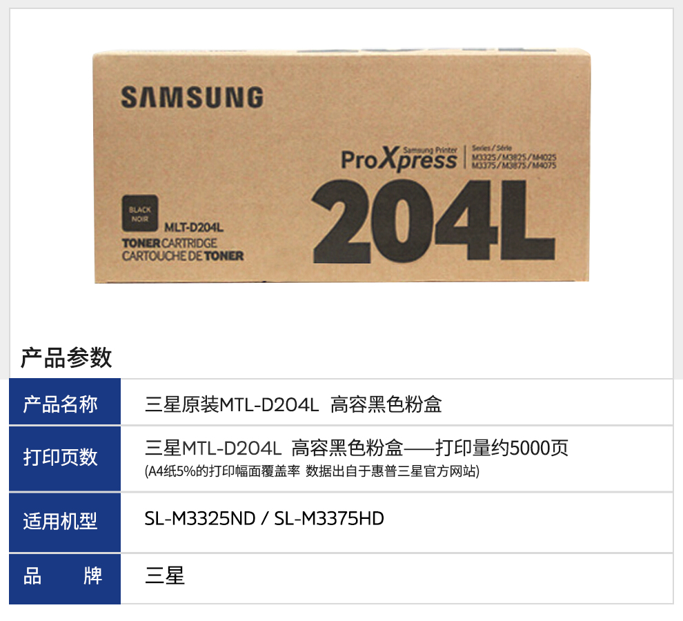 • 商品名稱:三星(SAMSUNG) MLT-D204S 標(biāo)準(zhǔn)容量 粉盒(適用于 SL-M3325/M3325ND/M3825/M4025/M3375/M3375ND/M3875/M4075)MLT-D204(kj)