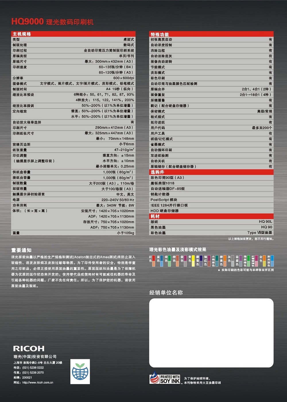 • 適用耗材:版紙HQ90L;黑油墨HQ90;TYPE VII型彩色油墨