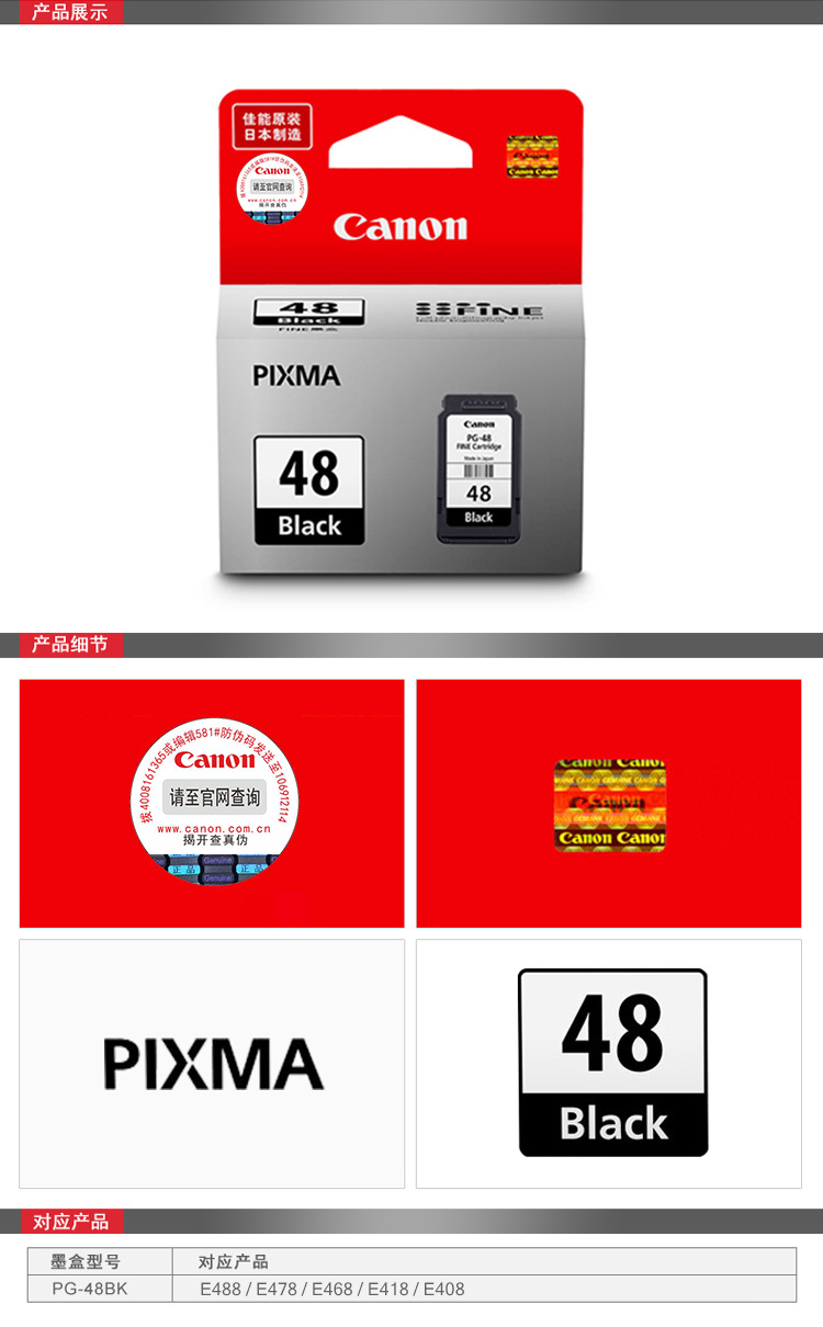 • 商品名稱:佳能(Canon) PG-48 黑色墨盒 (適用E488、E478、E468、E418)(kj)