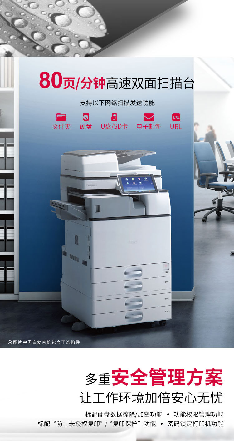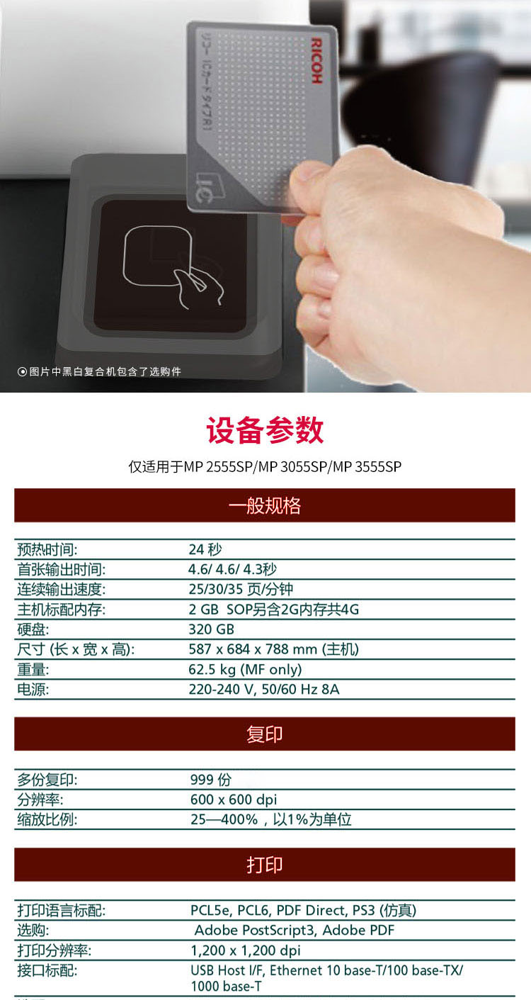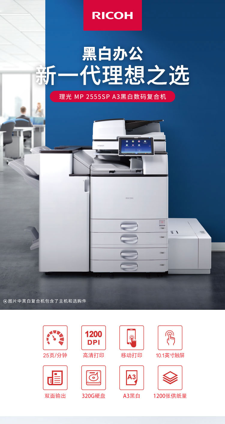 理光(Ricoh)MP 2555SP A3黑白數(shù)碼復(fù)合機(jī) 復(fù)印/打印/掃描 有線網(wǎng)絡(luò) 自動(dòng)雙面 含輸稿器 雙紙盒 工作臺(tái) 適用耗材:MP 3554C碳粉