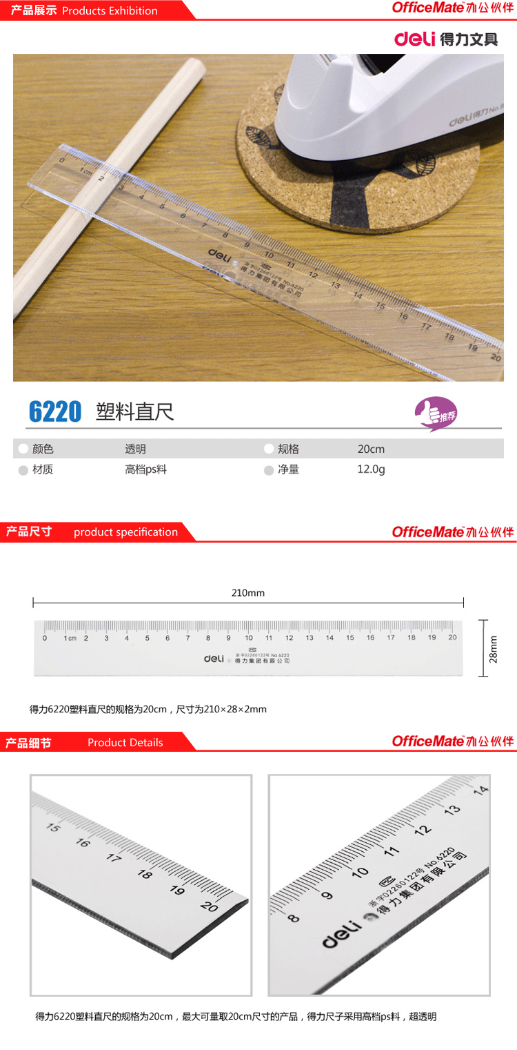 • 型號:得力(Deli) 6220 直尺 20cm 透明