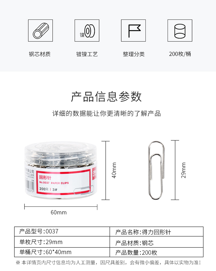 • 商品名稱:得力 回形針 3# 29mm規(guī)格:0037 200枚/筒 銀色 (kj)