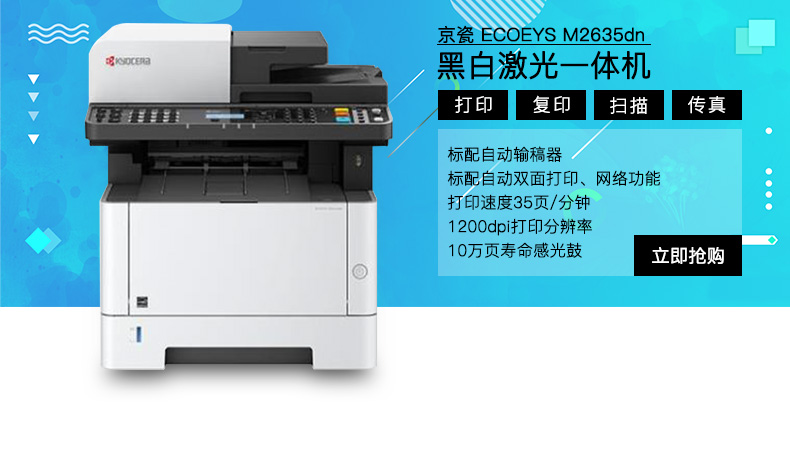• 商品名稱:京瓷(Kyocera)ECOSYS M2635dn A4黑白激光多功能一體機(jī) 打印/復(fù)印/掃描/傳真 標(biāo)配