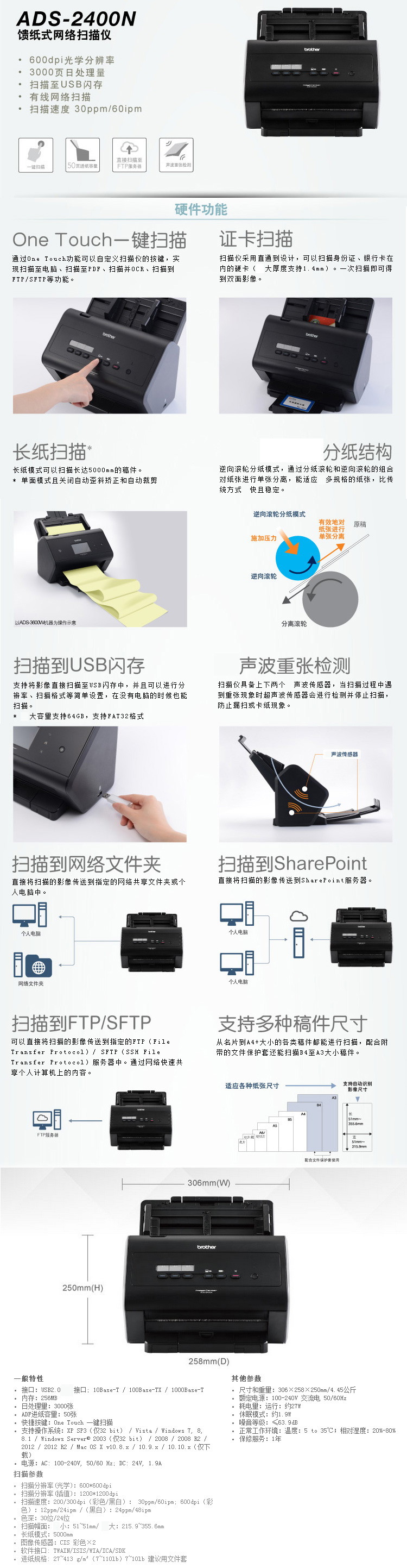 • 商品名稱:兄弟(brother) ADS-2400N A3幅面饋紙式掃描儀 掃描速度30ppm/60ipm 分辨率600*600dpi 一年保修