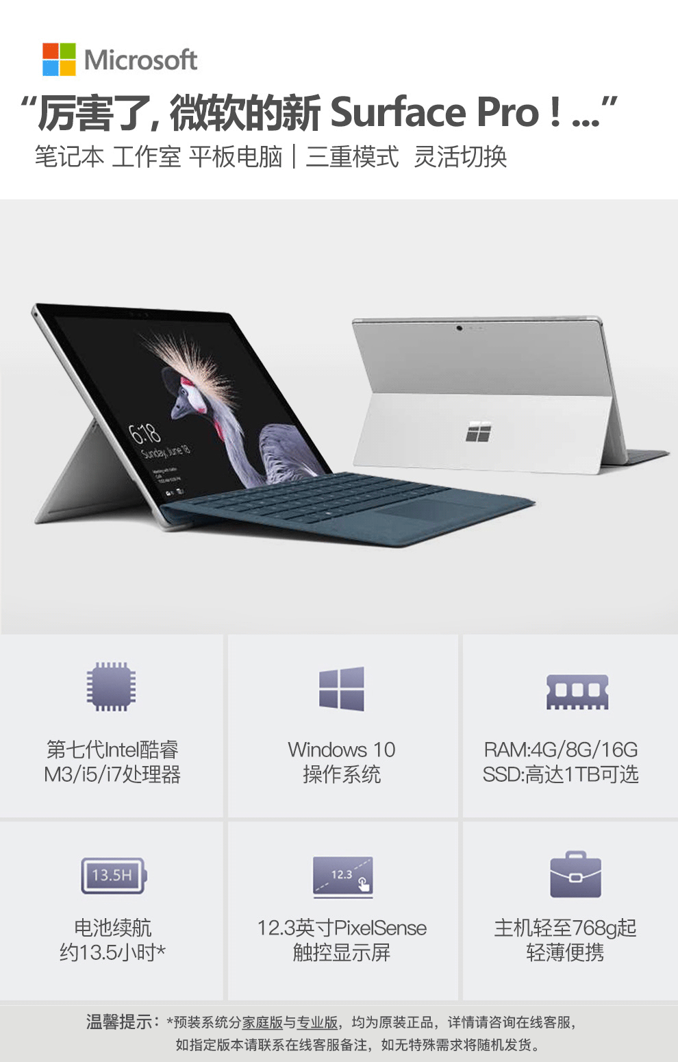 - 商品名稱(chēng):微軟(Microsoft)surface Pro5 平板式計(jì)算機(jī)(Intel Core i5/8G/128G/12.3寸/配原裝鍵盤(pán)和鼠標(biāo))