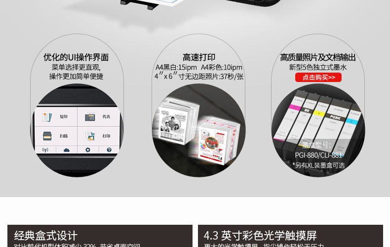 • 打印速度:黑白:15ipm(單面) 3ipm(雙面)彩色:10ipm(單面) 4"×6"照片(PP-201/無邊距):37秒