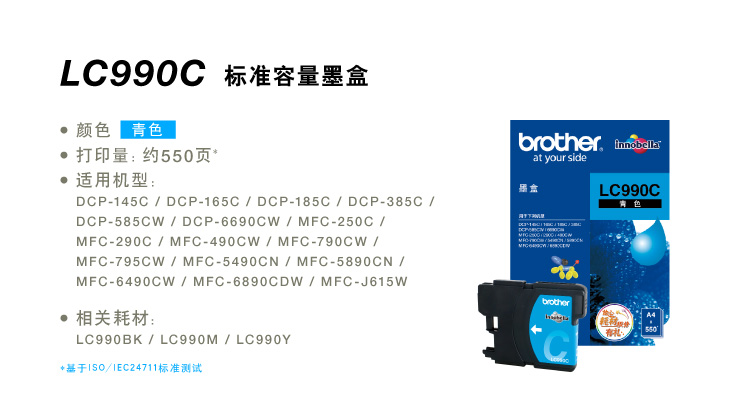 兄弟 墨盒 LC990C 青色 適用于(MFC-795CW/DCP-185C/MFC-250C/MFC-490CW/DCP-385C/DCP-6690CW/MFC-790CW/MFC-5490CN/MFC-5890CN/MFC-6490CW/MFC-6890CDW/DCP-145C/DCP-165C/MFC-290C/DCP-585CW)(kj)
