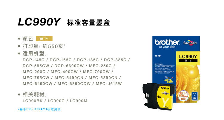 兄弟 墨盒 LC990Y 黃色 適用于(MFC-795CW/DCP-185C/MFC-250C/MFC-490CW/DCP-385C/DCP-6690CW/MFC-790CW/MFC-5490CN/MFC-5890CN/MFC-6490CW/MFC-6890CDW/DCP-145C/DCP-165C/MFC-290C/DCP-585CW)(kj)