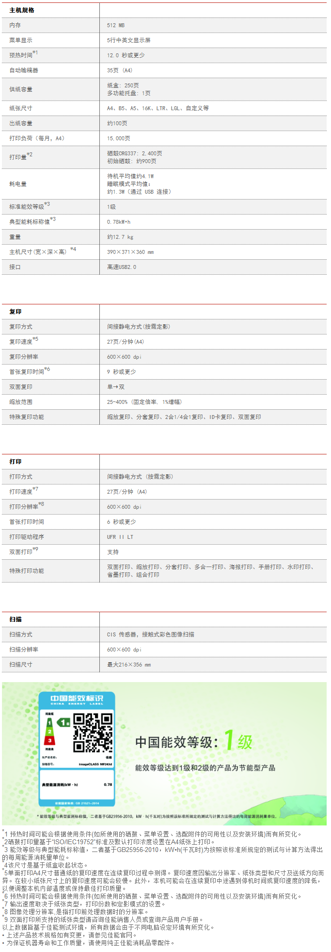 • 商品名稱:佳能(Canon)imageCLASS MF243d A4幅面黑白激光多功能一體機 打印復印掃描 適用耗材:CRG337 27頁/分鐘 600×600 dpi