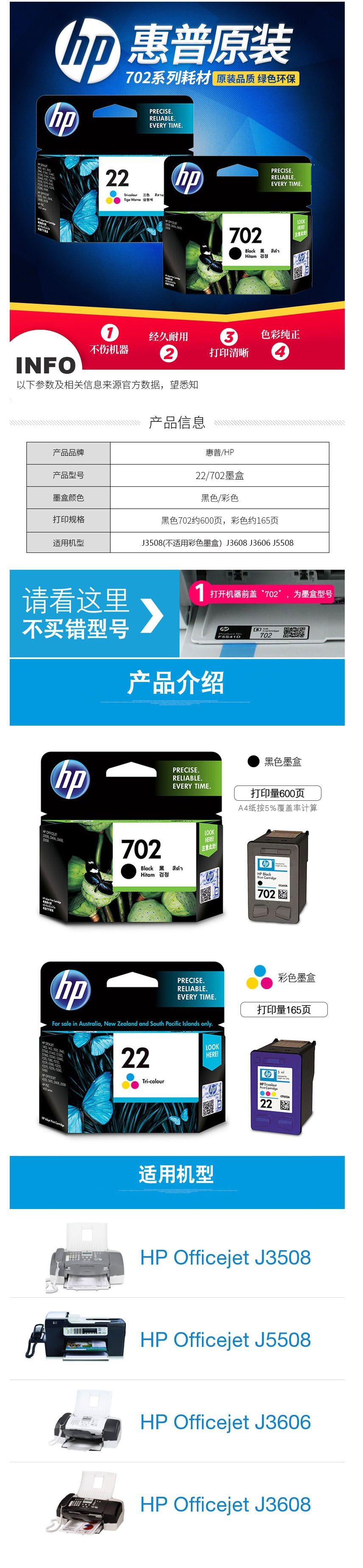 - 型號(hào):惠普(HP)C9352AA 22號(hào)彩色墨盒(適用 J3606 J3608 J5508) 彩色(165頁)