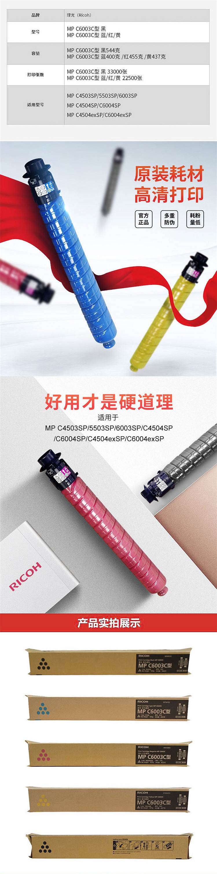 - 商品名稱:理光(Ricoh) MP C6003C 型 墨粉 黑色 適用于 MP C4503SP/5503SP/6003SP/C4504SP/C6004SP/C4504exsp/C6004exsp 打印量33000頁 (kj)