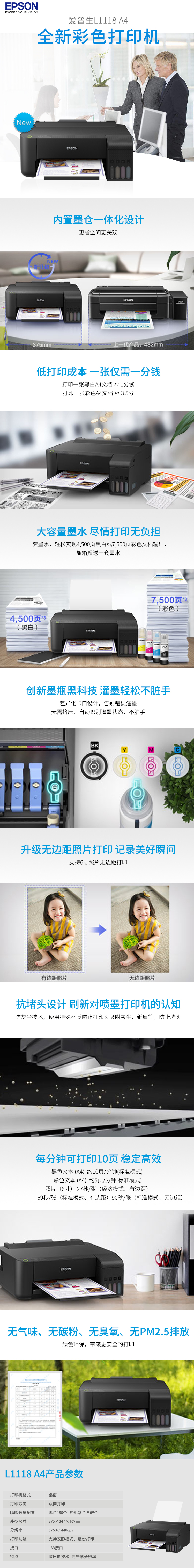 愛普生(EPSON)L1118 彩色噴墨打印機(jī) A4幅面 一年保修
