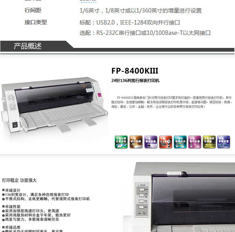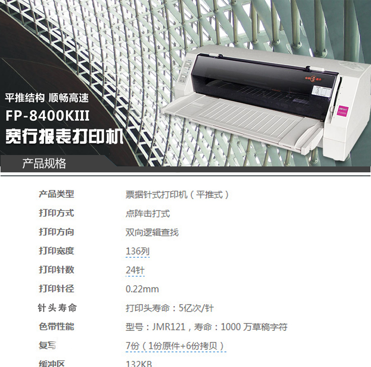 • 商品名稱:映美(Jolimark)FP-8400KIII 針式打印機 24針/136列 1+6聯(lián) A3幅面 不支持網(wǎng)絡(luò)打印 適用耗材色帶JMR121 5億次/針