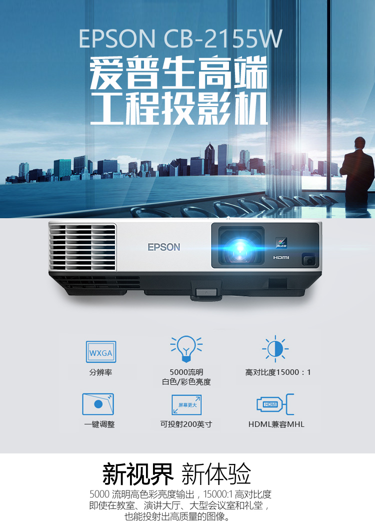 愛普生(EPSON)CB-2155W 高清商務(wù)工程投影機 5000流明 UHE燈泡光源 3LCD技術(shù) 高對比度 白色/手動變焦/1280X800dpi/30-300英寸