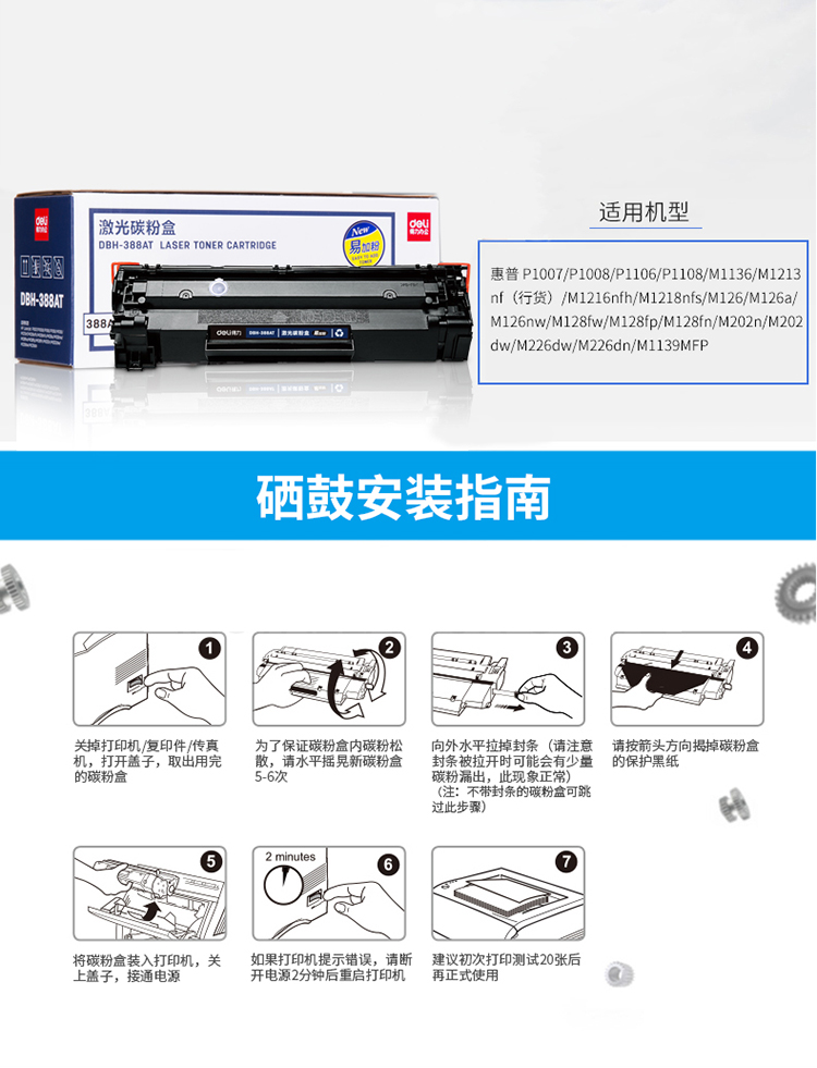• 商品名稱:得力(deli)DBH-388AT易加粉硒鼓/激光碳粉盒 388A 88A硒鼓(適用惠普HP P1007/P1008/P1106/P1108/M1136/M1213nf/M1216nfh)(kj)