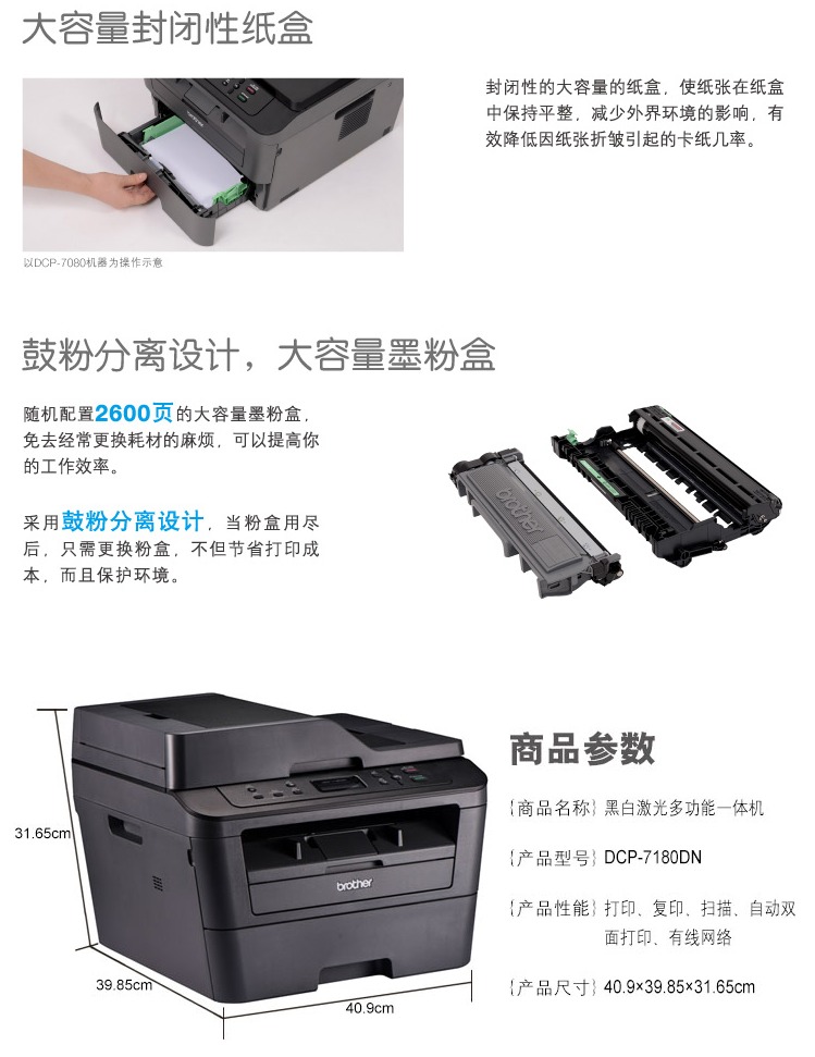 兄弟(brother)DCP-7180DN A4黑白激光多功能一體機(jī)(600×600dpi)(打印/復(fù)印/掃描)自動(dòng)雙面打印/支持有線網(wǎng)絡(luò)打印 30頁(yè)/分鐘 一年保修 適用耗材:DR-2350/TN-2312/TN-2325 鼓粉分離