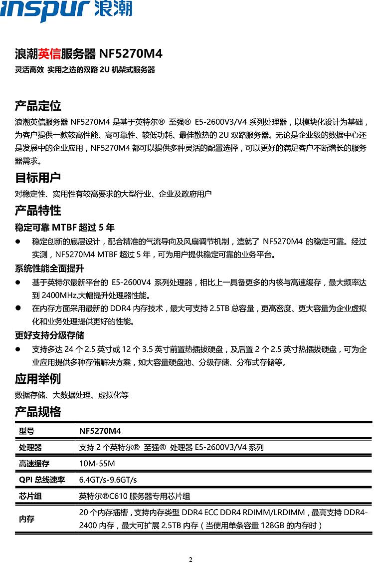 • 商品名稱:浪潮 NF5270M4服務(wù)器 E5-2620V4(8C,85W,2.1GHz)Processor Option Kit*1|16G RDIMM DDR4內(nèi)存*2|1TB SATA*2|INSPUR_NF5270M4_3.5HD_4口背板