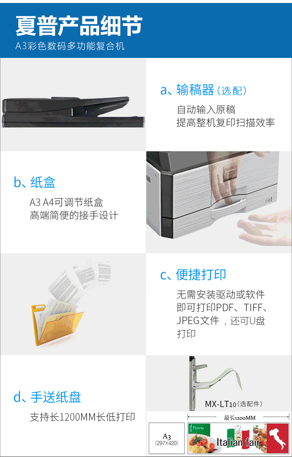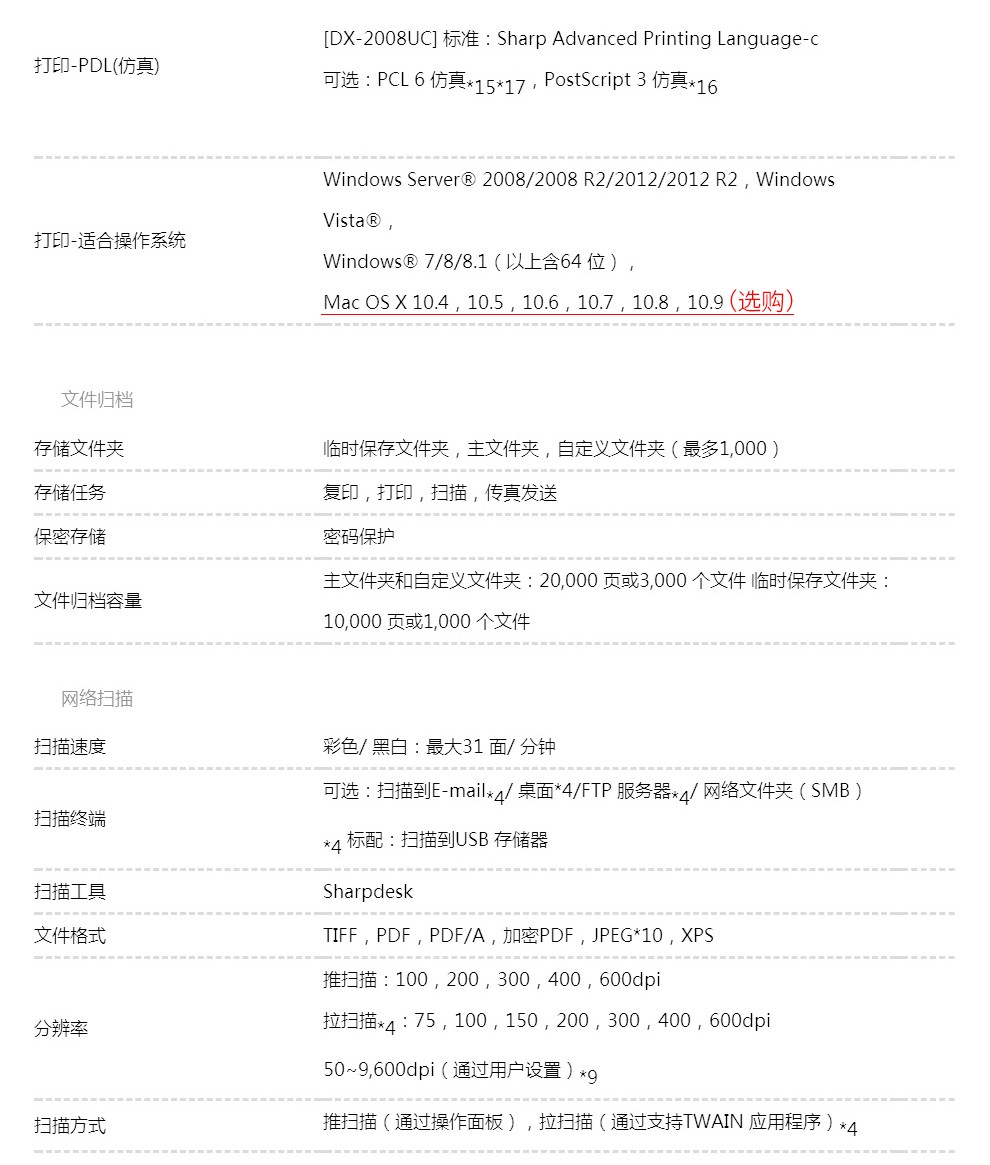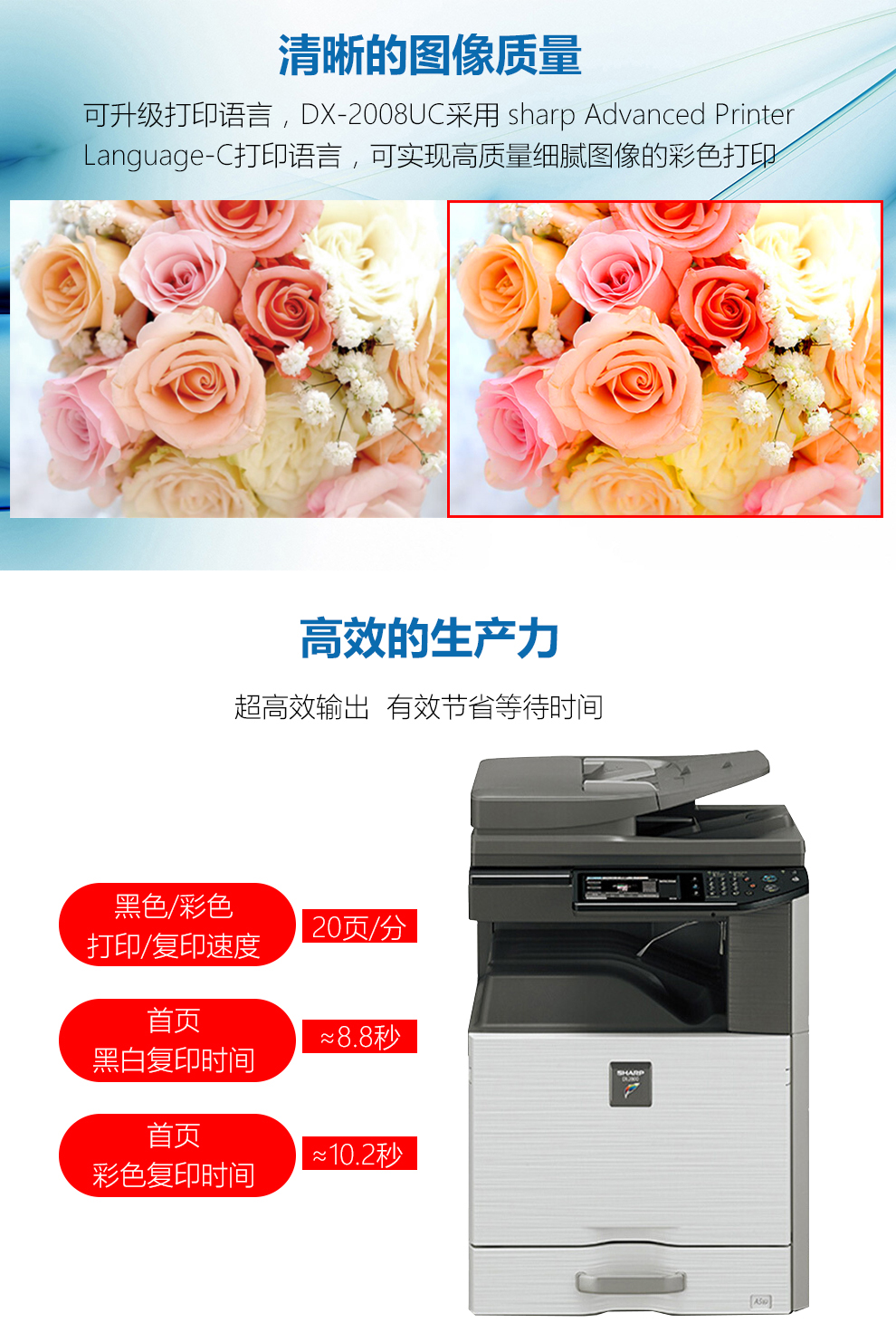 • 商品名稱:夏普(SHARP)DX-2008UC A3彩色數(shù)碼復(fù)合機標(biāo)配 有線網(wǎng)絡(luò) 600×600dpi 20 頁/ 分鐘 適用耗材:DX-20CT-BA/CA/MA/YA四色粉盒