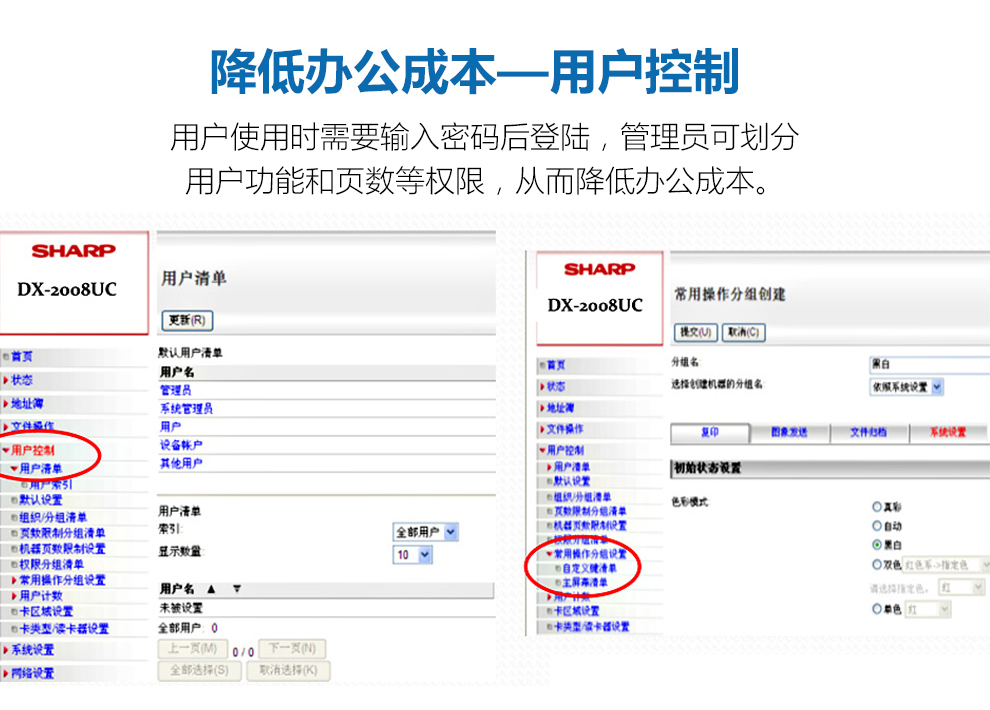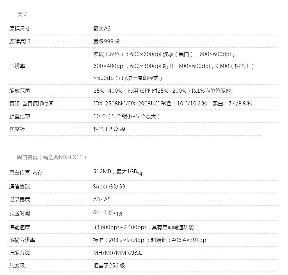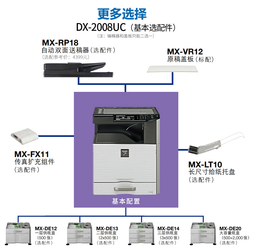 夏普(SHARP)DX-2008UC A3彩色數(shù)碼復(fù)合機標(biāo)配 有線網(wǎng)絡(luò) 600×600dpi 20 頁/ 分鐘 適用耗材:DX-20CT-BA/CA/MA/YA四色粉盒