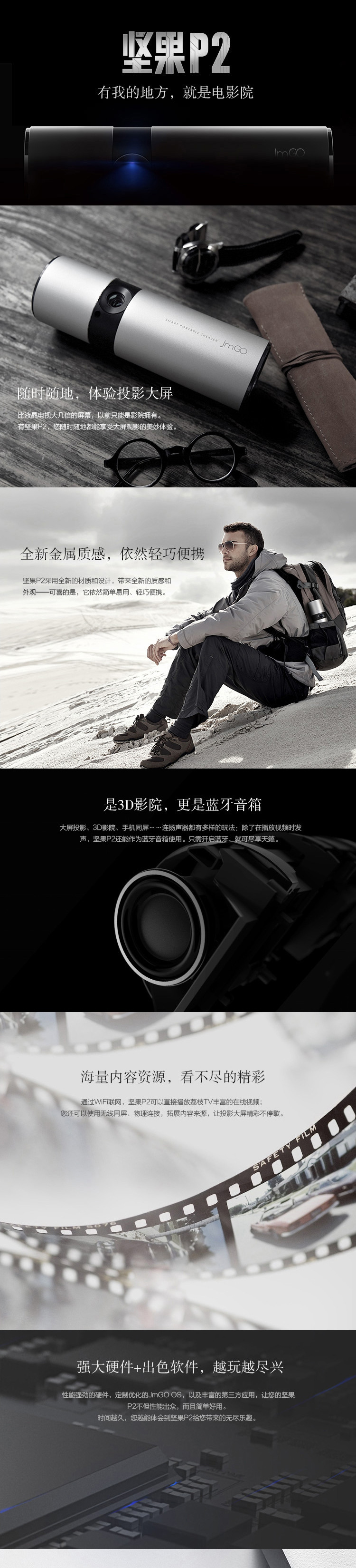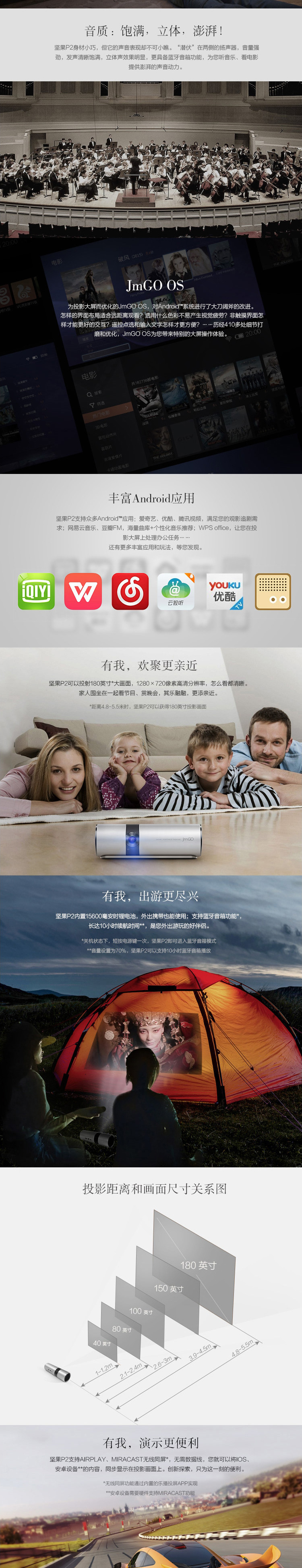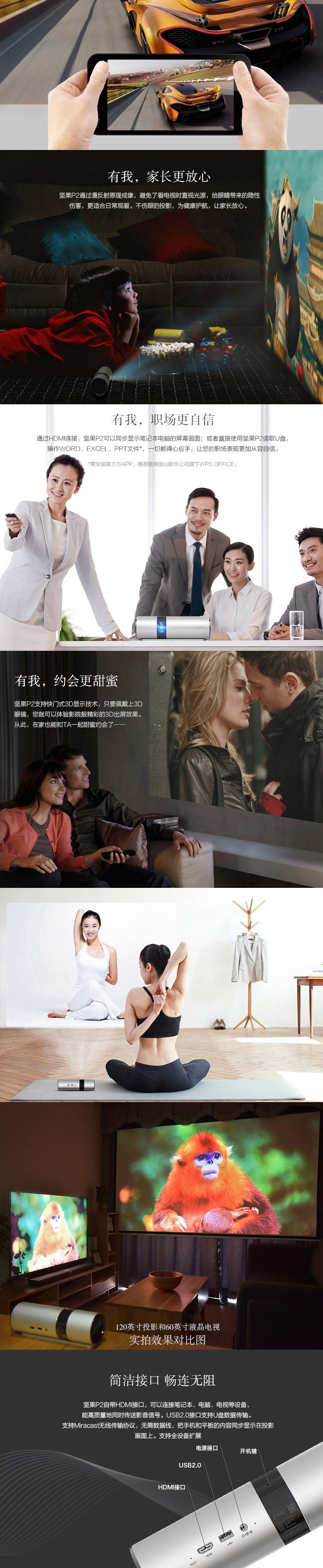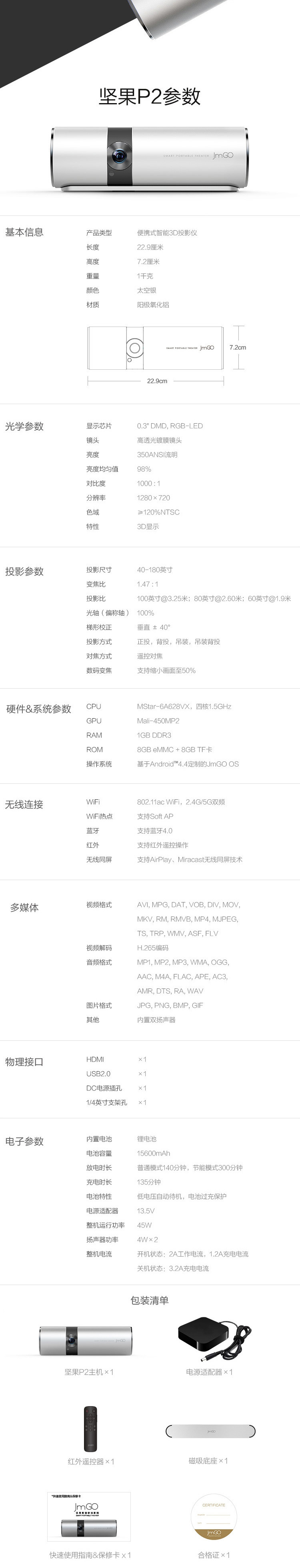 堅(jiān)果(JmGo)P2 便攜式投影機(jī) 銀色/亮度350ANSI流明/1000:1/分辨率1280*720