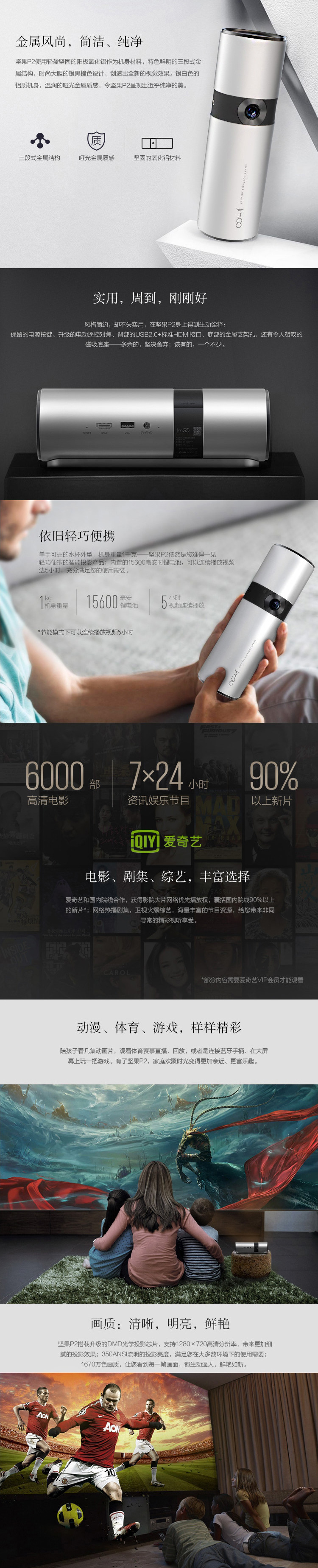• 商品名稱:堅(jiān)果(JmGo)P2 便攜式投影機(jī) 銀色/亮度350ANSI流明/1000:1/分辨率1280*720