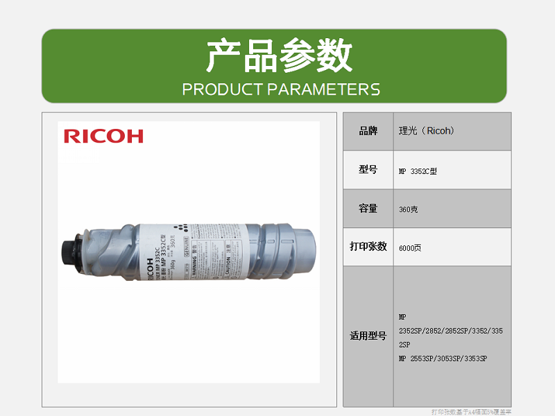 - 商品名稱:理光(Ricoh)墨粉MP3352C 適用于MP2352SP/2852/2852SP/3352/3352SP MP2553SP/3053SP/3353SP