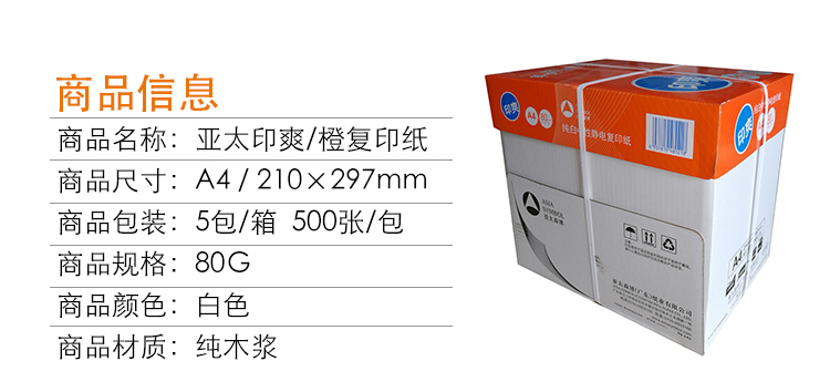 • 商品名稱:印爽 A4 80G 復(fù)印紙(橙色裝)500張/包 5包/箱