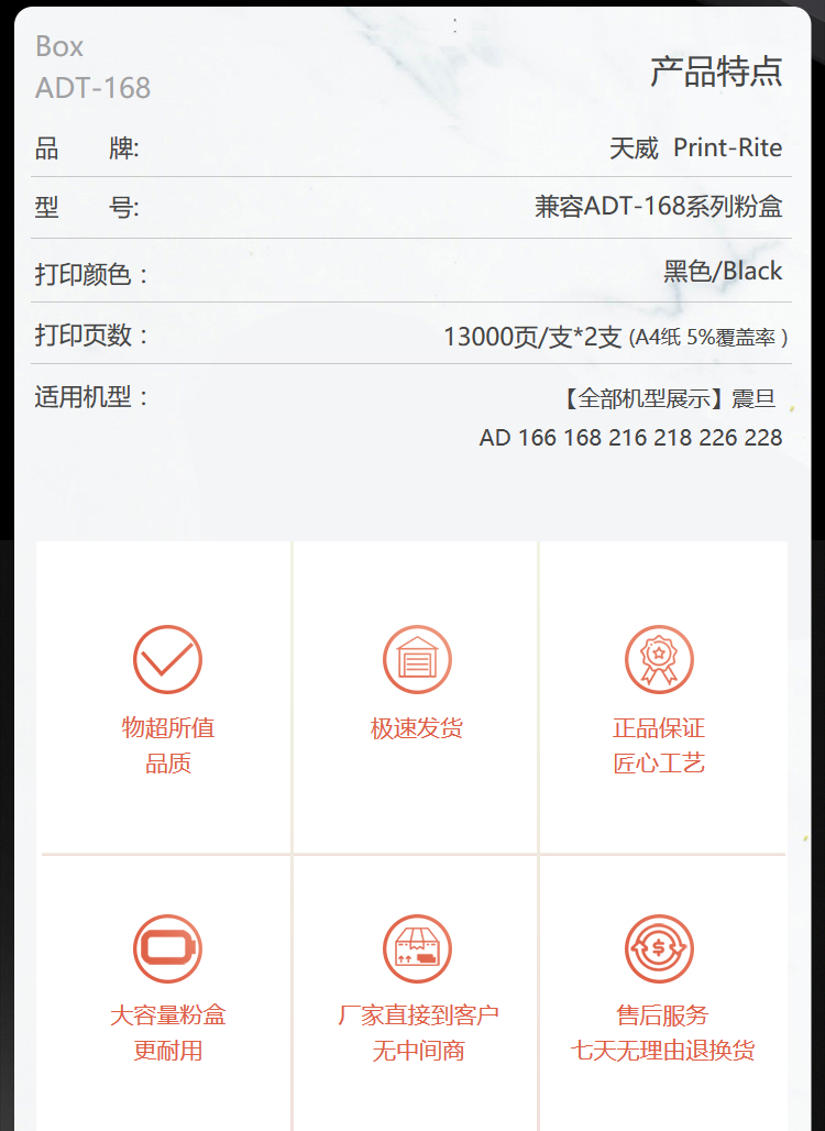• 商品名稱(chēng):天威 ADT-168 復(fù)印機(jī)粉盒雙支裝13000頁(yè)*2支 黑色 適用于震旦 AD 166 168 216 218 226 228