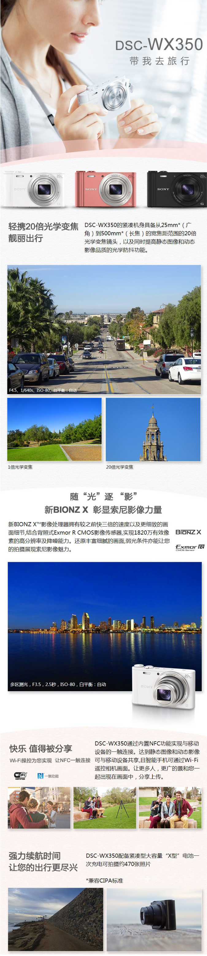 索尼(SONY) DSC-WX350 數(shù)碼相機 黑色(1820萬有效像素 20倍光學(xué)變焦 25mm廣角 Wi-Fi遙控拍攝)