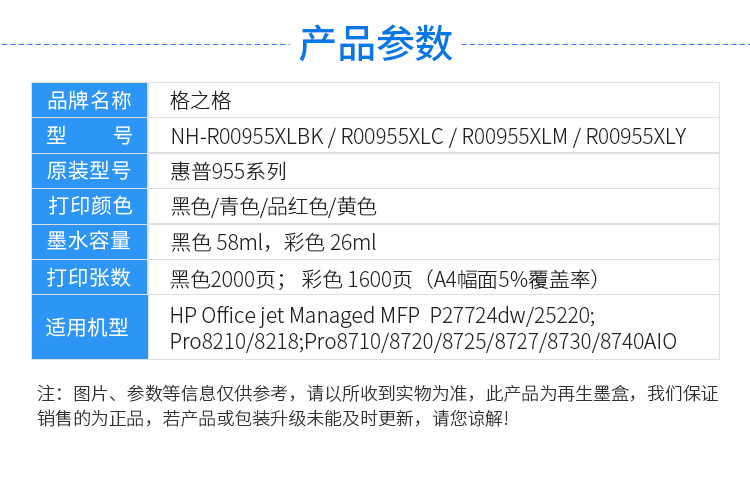 格之格/G&G NH-R00955XLY墨盒26ml黃 適用于HP Officejet Managed MFP P27724dw/25220;Pro8210/8218/7720/7730;Pro 8710/8720/8725/8727/8730/8740AIO