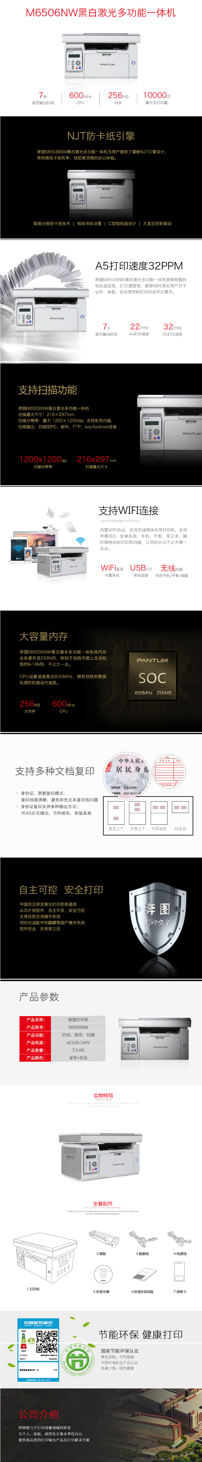 • 商品名稱:奔圖(PANTUM)M6506NW黑白激光多功能一體機(jī)(打印 復(fù)印 掃描)22張/分鐘 網(wǎng)絡(luò)/WIFI功能