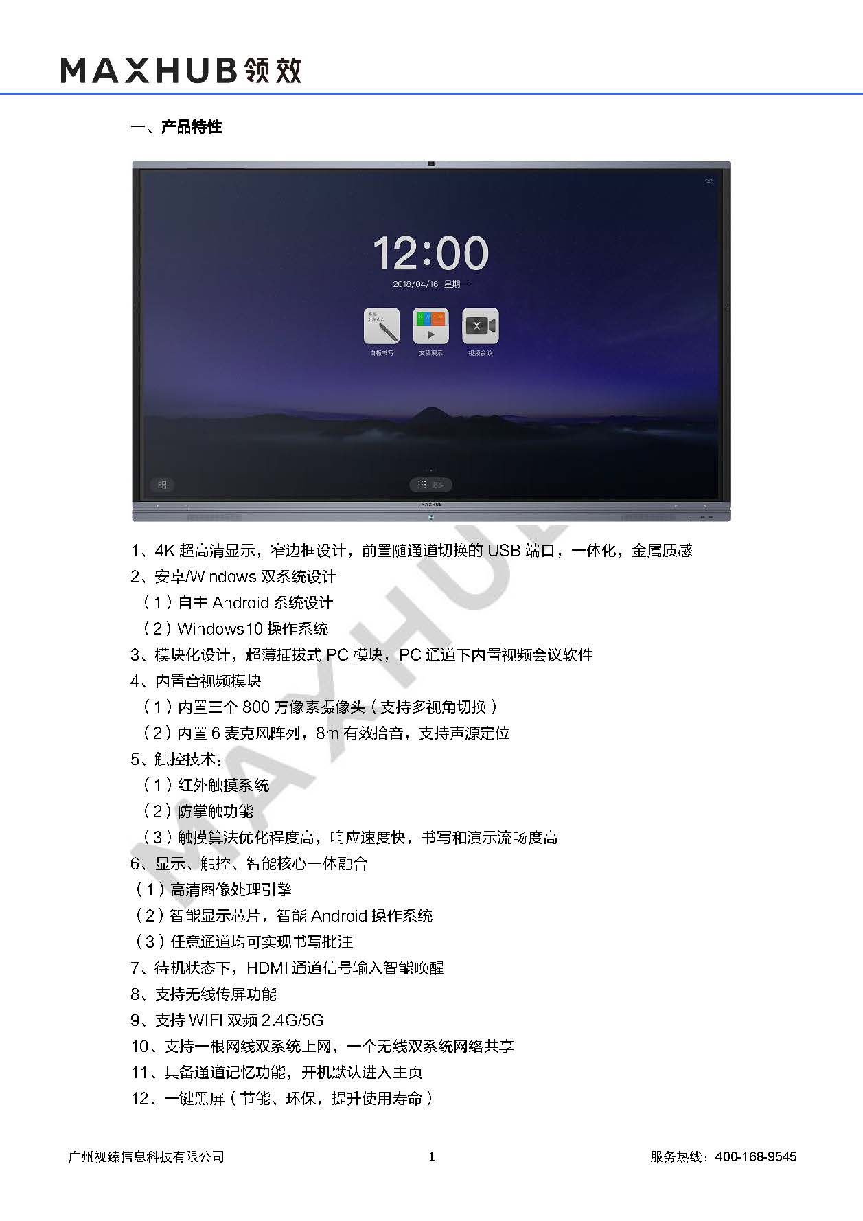 • 商品名稱:MAXHUB TC75CA普通電視設(shè)備 電視機(jī) TC系列 國(guó)密安全版75寸觸控智能會(huì)議平板電視 支持雙系統(tǒng) 內(nèi)置 800W 攝像頭 4K超高清顯示 含I5模塊/無(wú)線投屏/觸控筆/掛壁/原廠保修一年 加一年屏幕延保/包送貨上門安裝培訓(xùn)