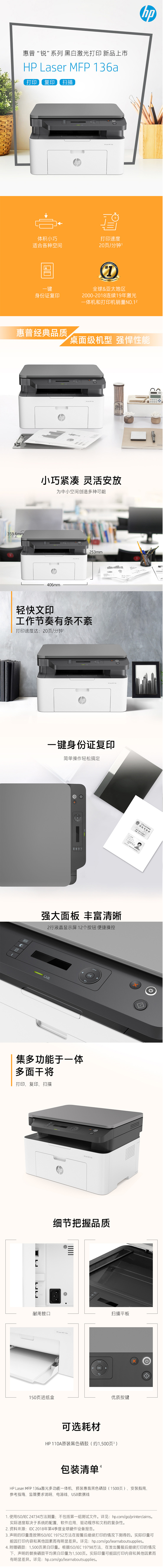 • 商品名稱:惠普(HP)Laser MFP 136a A4黑白激光多功能一體機 打印/復(fù)印/掃描 20頁/分鐘 手動雙面 1200*1200dpi 有線網(wǎng)絡(luò)打印 適用耗材:W1110A 一年保修