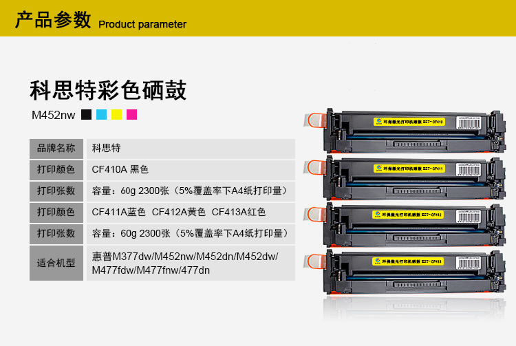 • 商品名稱:科思特(KST)一體式硒鼓 CF411A 專業(yè)版黃包 適用于HP Color LaserJet MFP M377DW/M452nw 打印頁(yè)數(shù)2300頁(yè) 藍(lán)色