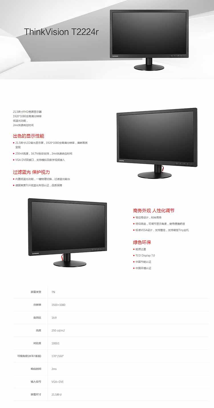 - 商品名稱:聯(lián)想/Lenovo T2224rbA 顯示器 21.5寸 1920*1080