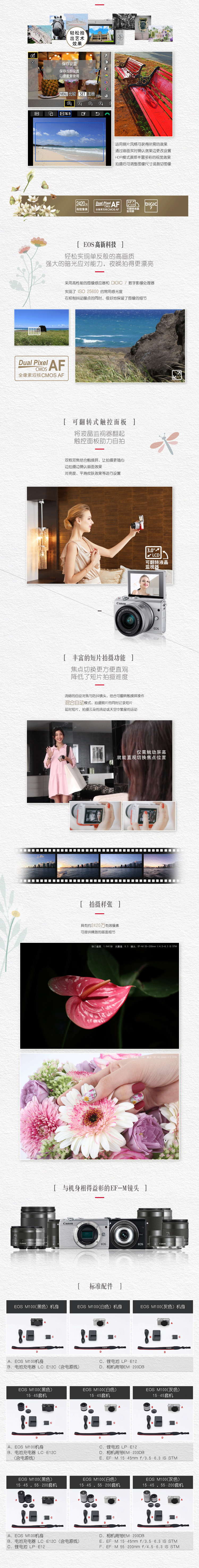 • 商品名稱:佳能(Canon)EOS M100 黑色單頭套機(jī) 含EF-M15-45MM F/3.5-6.3 IS STM鏡頭 2420萬像素 觸控翻轉(zhuǎn)LCD 全像素雙核對(duì)焦
