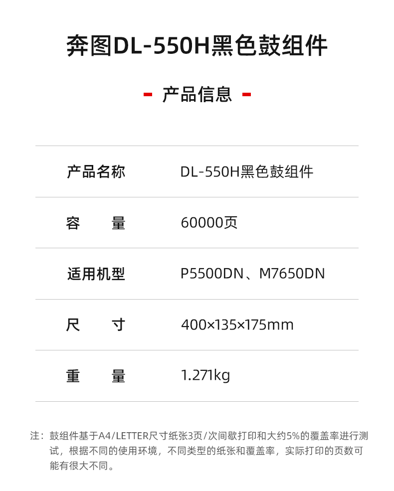 • 商品名稱:奔圖(PANTUM)DL-550H 原裝鼓組件(適用于P5500DN/M7650DN) 60000頁