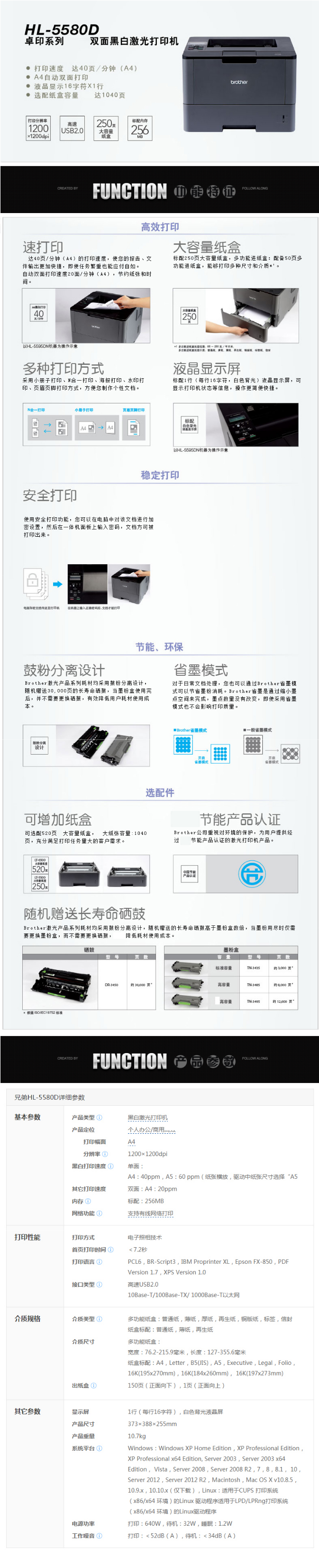 - 商品名稱:兄弟(brother) A4幅面黑白激光打印機HL-5580D 不支持網(wǎng)絡打印 40頁/分鐘 自動雙面打印 適用耗材:TN-3435/DR-3450 一年保修
