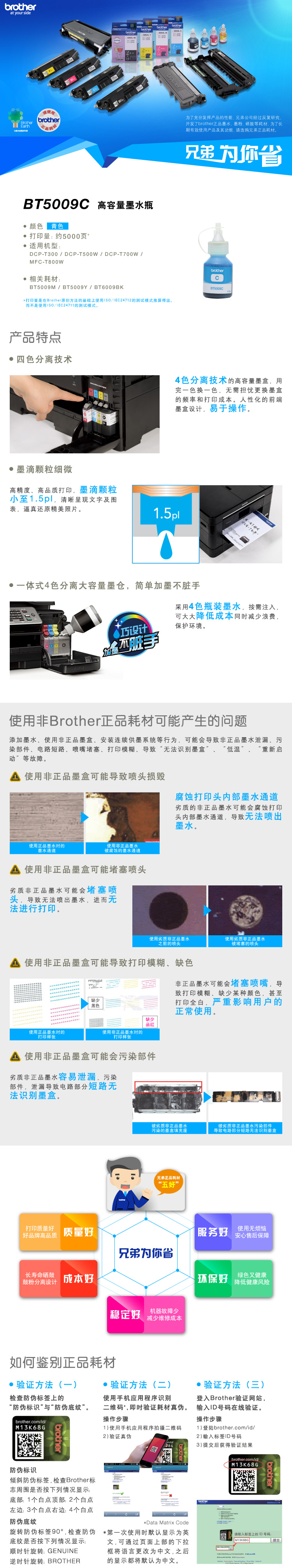 - 商品名稱:兄弟(brother)BT5009C 青色墨盒 (適用于兄弟打印機(jī)DCP-T500W / DCP-T300)